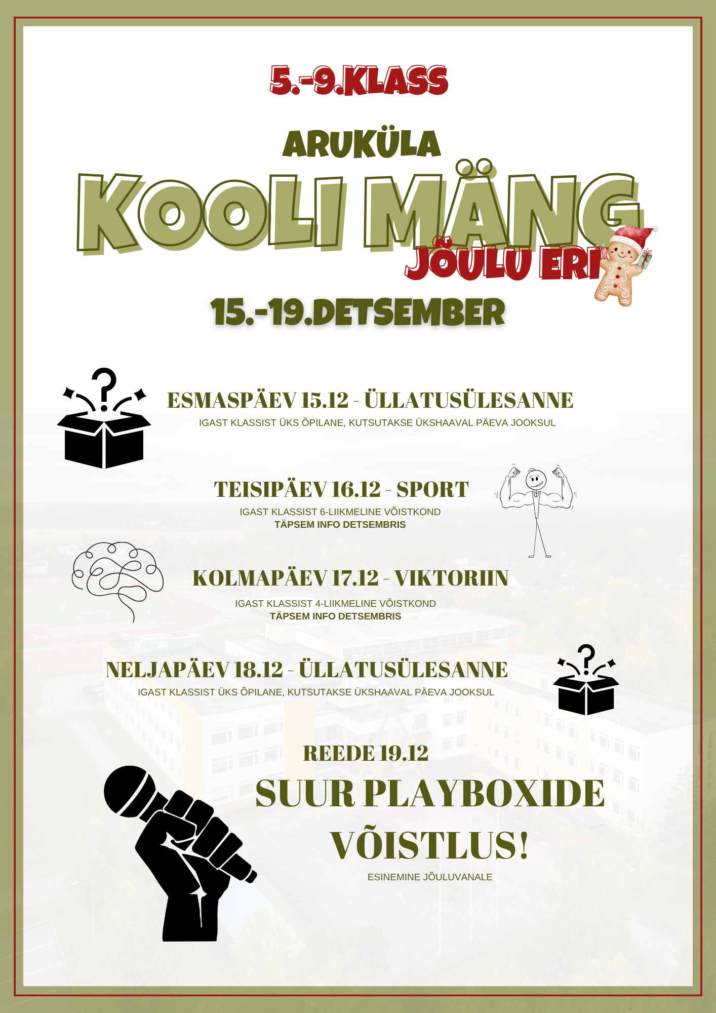 5.-9. klassi õpilased selgitavad välja KooliMängu võitja, võisteldes spordis, viktoriinis, üllatus-ülesannetes ja PLAYBOXI´dega :)