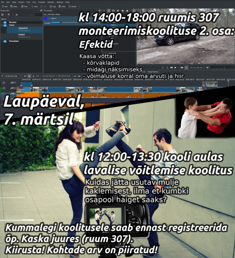 7. märtsil kl 14.00 - 18.00, ootab õp Kaska taaskord videomonteerimise huvilisi. Toimub koolituse 2. osa - EFEKTID!